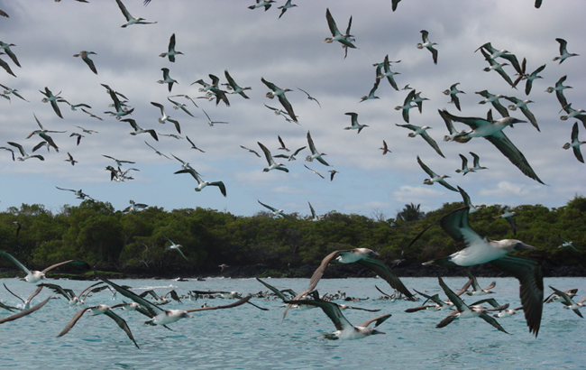 We hiked back down and headed back toward town noting at least six Vermillion Flycatchers along the way. Billy knew of a side road that went past a gravel pit that had some water in it and we stopped to scope a flock of We stopped in town again for more phone calls and chocolate and coke supplies. Then we met back at the town dock where Bob spotted some baby Marine Iguanas and a Whimbrel out on the beach. We went back to the San Jose for lunch. It was a gorgeous afternoon and we were surrounded by turquoise water. Angel and Diane could not resist the opportunity for a swim around the boat while others of us took a dinghy ride after lunch. We surveyed a large group of Blue-footed Boobies perched on some lava and then made our way toward the mangroves. Gina and Bob spotted a lone Black-bellied Plover feeding on the edge of a small lava island. We landed at Las Tintoreras and walked a trail through some rough lava to a bridge over an inlet which held at least 20 White-tipped Reef Sharks. We were amazed at how small the area was and how many sharks were there and Billy explained that the sharks were attracted by fresh water that filtered through the unique lava formations here. On the other side was a lagoon that had two Spotted Eagle Rays and we were able to get close looks at them. There were many baby Marine Iguanas along the trails and clinging to the rocks and we imagined their fates if they fell into the shark pools. We enjoyed our visit to this unique place and made our way back to the dinghies. As we headed toward the San Jose, we encountered another feeding frenzy of Blue-footed Boobies, this time at least 1,000 to perhaps 1,500 boobies flying and plunge diving all around us. Large groups would take off from the water and circle up only to drop like bullets into the water. It was incredible to be in the middle of this spectacle and we were simply in awe of the amazing sights around us.