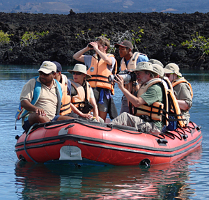 We continued down the road and were dropped off at the Hotel Wittmer. Some of us enjoyed the museum with its many historical displays while others sat outside the hotel and relaxed overlooking a black sand beach with the San Jose the only passenger ship in view in the harbor. As lunch time approached, we went back to the We met at the bar for a farewell cocktail from the Captain and our fantastic crew. Some of us showed our thanks by performing some of the birds and animals that we had seen during our cruise. Of particular note were the dueling Waved Albatrosses performed by Penny and Kris. At the evening briefing, Billy described a special, unscheduled stop in the early morning for Great and Magnificent Frigatebird. Another great day and now an extra excursion in the morning! Tuesday, July 24, 2007 We walked a trail along the beach as the sky was now brilliant blue and crystal clear. Sea Lions, Mangrove Warblers, Galápagos Flycatchers, and a Small Ground-finch were seen as we walked the trails. By the time we reached the landing site, a large cruise ship had dropped what seemed like hundreds of passengers on shore. We were glad we chose to visit this magical place at first light and have it to ourselves.